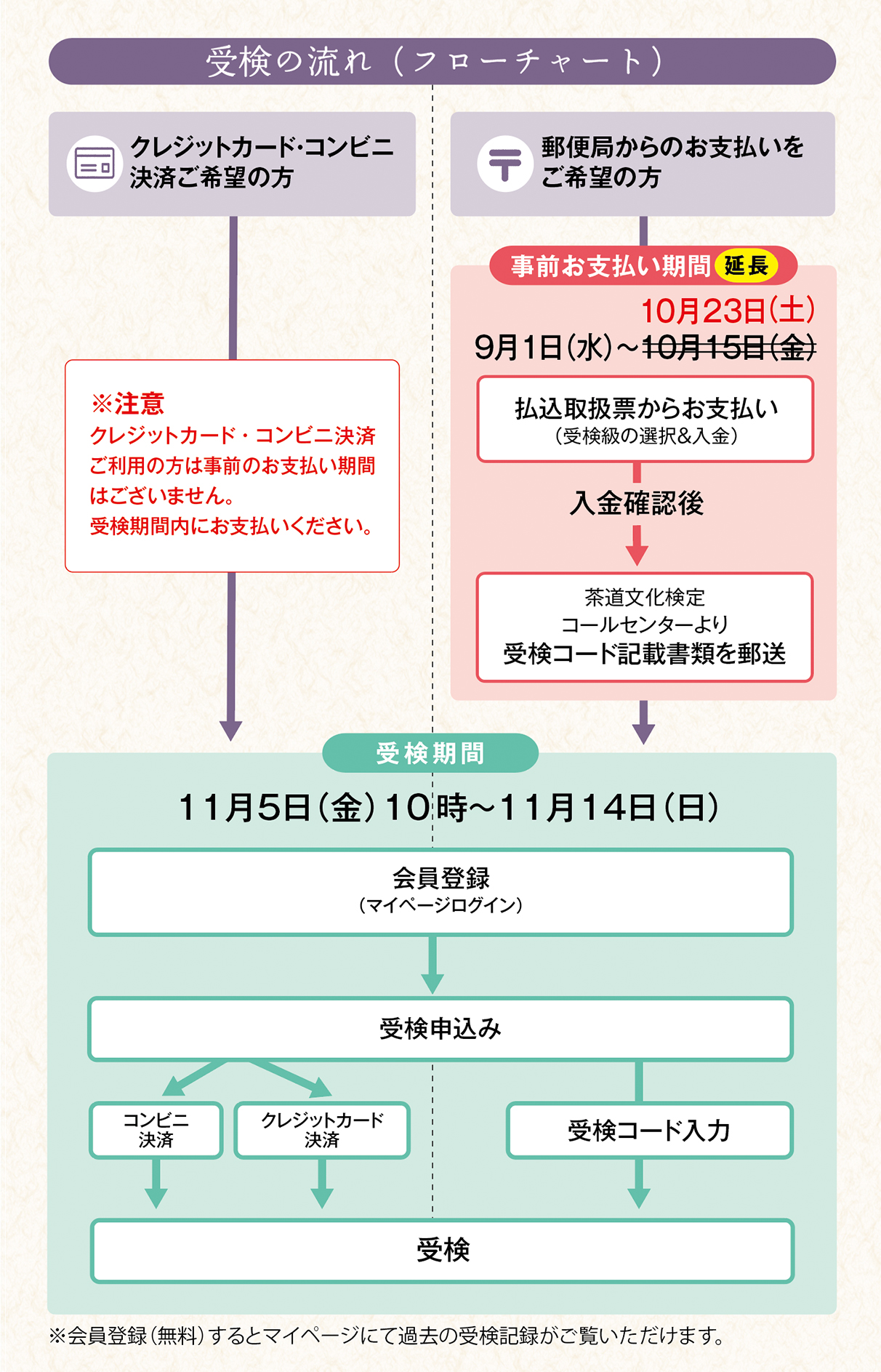 茶道⽂化検定Web版は「クレジットカード・コンビニ決済」と「郵便局からのお⽀払い」の3種類のお⽀払い⽅法があり、それぞれお申込みの⼿順が異なります。